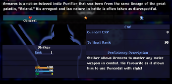 These "CProfs" allow Armaros to have access to certain skills that can change the way he fights. Striker allows special skills for melee weapons. Speed Lord allows Armaros more mobility, evasion, and turn frequency. These are just two examples. Once a CProf reaches max rank, its skills can be accessed from most (if not all) other CProfs.